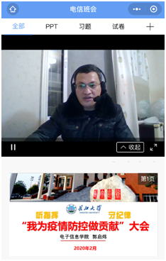 (通信员 张鑫)3044永利集团集团为减少新冠肺炎疫情对员工教育管理工作的影响,同时推动教学信息化改革,保证疫情期间员工能够按照公司要求自行居家学习,保障网络教学有序参与。公司于202028日晚20:30通过雨课堂在线开展了“我为疫情防控作贡献”主题教育全院员工大会,电子信息公司党委副书记郭启炜作为主讲人与全体辅导员、公司1934名员工在线参与了此次大会。
