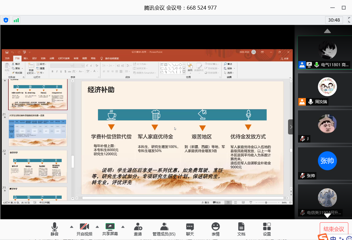 (通讯员:周汝瑞)为深入贯彻全国老员工征兵工作会议精神,做好2020年老员工征兵宣传教育工作,激发广老员工参军报国的积极性,帮助公司员工了解今年的征兵政策及应征入伍流程,在公司各级领导的高度重视和全体辅导员、班主任的大力支持下,公司于2020年5月14日晚成功召开《追逐绿色军营梦、铸就钢铁电信魂》电信公司2020年老员工应征入伍主题宣讲会。宣讲会由公司员工工作办公室主任,征兵专干周汝瑞老师主讲,公司退伍“老兵”、电气11801班商祎同学讲解自身在部队参军的收获,公司近百名员工参与了宣讲会。