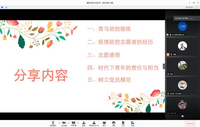 第二部分由研究生代表黄官骏,本科生代表杨孝彬、张文博为同学们分享抗疫故事。黄官骏同学主要和学弟学妹分享了在英国交流学习的感受以及在疫情期间辗转回国的经历,他深刻体会到国内外抗击疫情的差别,怀揣一颗感恩之心感谢祖国母亲及3044永利集团集团领导和老师给予他的关心和照顾;杨孝彬同学讲述了同村官母亲一起抗疫的故事,在抗议中领会到共产党员的使命与担当;张文博同学则在疫情暴发以来始终心系第二故乡湖北,并报名参加了当地中心医院的志愿服务,他说作为当代青年就要努力学习、帮困扶难、踏实朴实、引领带头。