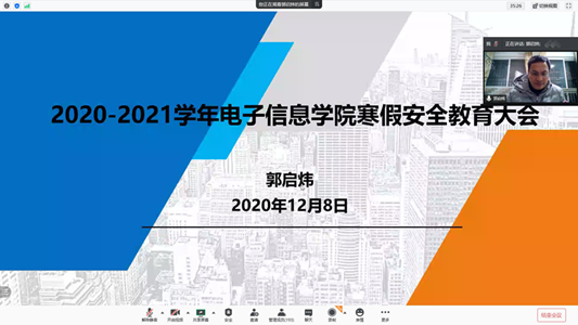 本次电子信息公司全院寒假安全教育主题大会于2020年12月8日在郭启炜书记的亲自主持下召开,根据年级20、19、18、17分别召开会议,各年级分会会议时长一个小时,本公司所有同学悉数到场参会,真正做到了全院参与,共同学习,全员教育。会议内容分为五大部分,分别为: