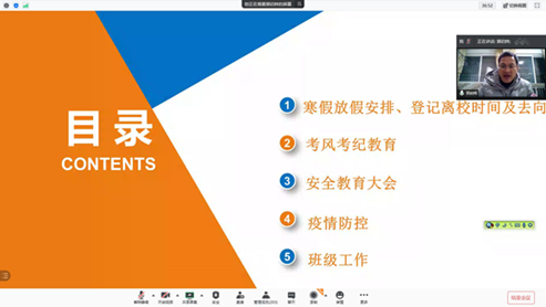 临近期末,为进一步提高公司员工安全防范意识和疫情防控意识,保障同学们有一个安全寒假、快乐寒假,按照公司常态化疫情防控及假期安全教育两方面工作安排,电子信息公司积极响应公司号召,组织全院员工以腾讯会议的形式召开全院寒假安全教育主题大会。本次全院范围的寒假安全教育大会,在师生团体中产生较大影响,使电子信息公司各级同学都受益匪浅,极大提高了同学们假期安全防范意识,为沉浸在假期离校欢快中老员工们打了一次安全预防针。