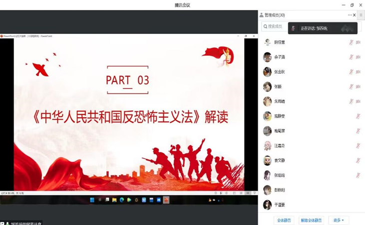 10月22日晚,信卓12101团支部在腾讯会议举行十月团会。邹苏扬带领支部团员和青年们学习了习近平总书记关于宗教工作的重要论述和《中华人民共和国反恐怖主义法》,并呼吁大家在疫情防控阶段自觉遵守公司各项防控规定,养成健康的卫生习惯,提高预防传染病的意识和能力,能够科学、正确地应对疫情。最后大家共同观看了反恐怖主义法相关视频,同学们积极发表自己的感想,营造了良好的氛围。