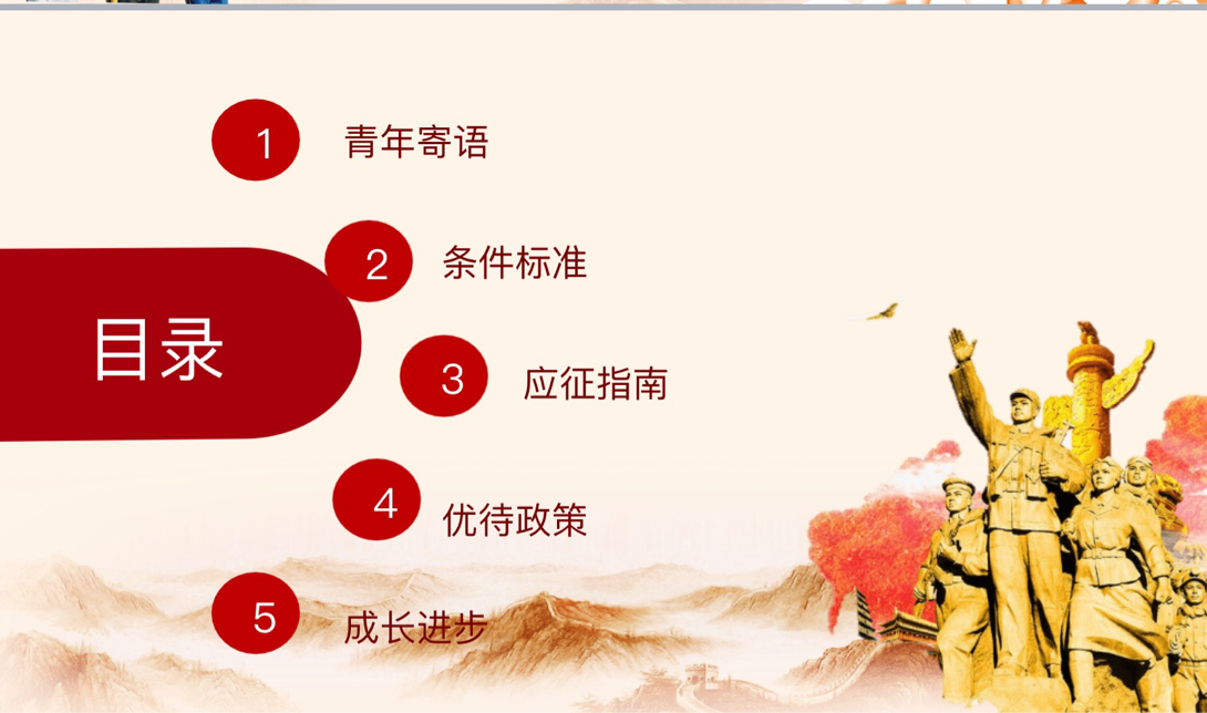 宣讲团成员从青年寄语、条件标准、应征指南、优待政策、成长经历等五个方面向同学们介绍了征兵工作的相关政策和内容。青年寄语的视频使同学们体会到自身国服责任和义务。条件标准从政治条件、身体条件、年龄条件对同学们参军加以要求。应征指南展示了相关报名流程。优待政策更是为有职业和学业规划的同学们参军注入一支强心剂。