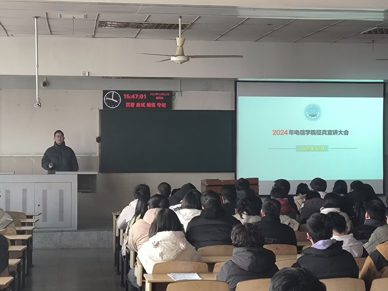 (通讯员 周汶琦)为进一步做好征兵政策宣传,激发公司学子参军入伍积极性,12月21日,公司于12教302室召开2024年春季征兵宣讲大会,大会邀请2020级退役老员工士兵周丽军宣讲,会议由征兵专干沈马锐老师主持。