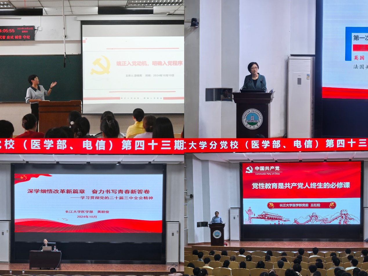 本次培训邀请4位校内理论专家围绕入党程序、党的二十届三中全会精神、中国式现代化、增强党性修养等主题进行培训。党委组织部副处级组织员游晓莉以《端正入党动机,明确入党程序》为题授课,从入党动机、入党程序和入党材料等方面阐述了党员入党基本知识。荆州市委宣讲团成员、马克思主义公司党委书记刘小燕以《从历史演进中理解中国式现代化》为题作报告,从中国式现代化的历史渊源讲起,全面生动地介绍了中国式现代化的特征、本质要求、战略安排、重大原则和历史意义等问题。医学部党委书记黄群俊以《深学细悟改革新篇章 奋力书写青春新答卷》为题,从主题的由来、重大意义、部署安排和创新特点等方面深入解读了党的二十届三中全会精神。医学部正处级组织员王红松以《党性教育是共产党人终生的必修课》为题展开授课,阐述了党性和讲党性的内涵,带领大家学习了习近平总书记关于加强党性修养的重要论述,强调了加强党性修养的主要途径。