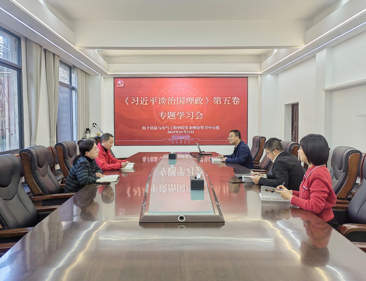 10月22日上午,电子信息与电气工程公司党委理论学习中心组在10教205会议室开展《习近平谈治国理政》第五卷专题学习,郭梅主持学习会。