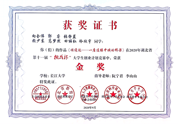 系统于2018年8月开始开发,于2019年8月基本完成,并在2019年10月获得计算机软件著作权。2019年10月第十一届“挑战杯”老员工创业计划竞赛的消息传到了公司。但是要做一个大项目可不是一件容易的事情,它需要各方面的人才,一个大团队来担当。积极联系下,来自电子信息公司信工卓越11701班的向全伟、张静蓝、高梦然、赖少东、田丽弘、信工11703班的冷欣宇和经济与管理公司经济11701班的郭睿等7名同学组成了“开创者”团队,向全伟担任队长,张静蓝担任主答辩人,并邀请了阮宁君、李山山老师来做他们的指导老师。刚好他们几位同学在参与老师的一个科研项目,在阮老师的同意下他们选择了一个专题——《顺通达——一座连接中俄的桥梁》,对它进行了深入研究并写成了创业计划书获得了湖北省金奖。