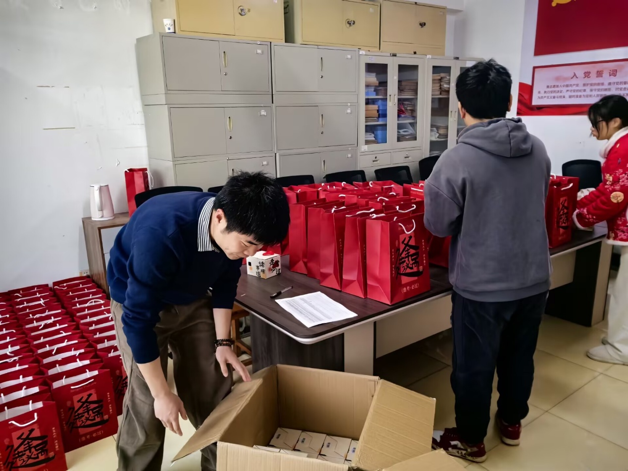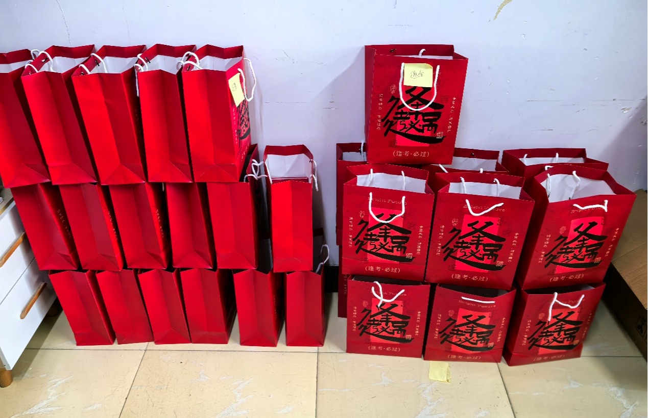 12月伊始,公司便开始策划研途送温暖活动,公司领导亲身参与策划,和年级辅导员、班主任一起组成“送福小分队”积极配合,共同开启暖心祝福。12月16日上午,员工志愿者开始考研大礼包的分装,大家分工明确,井然有序地将一份份蕴含着美好寓意的礼物包装好。